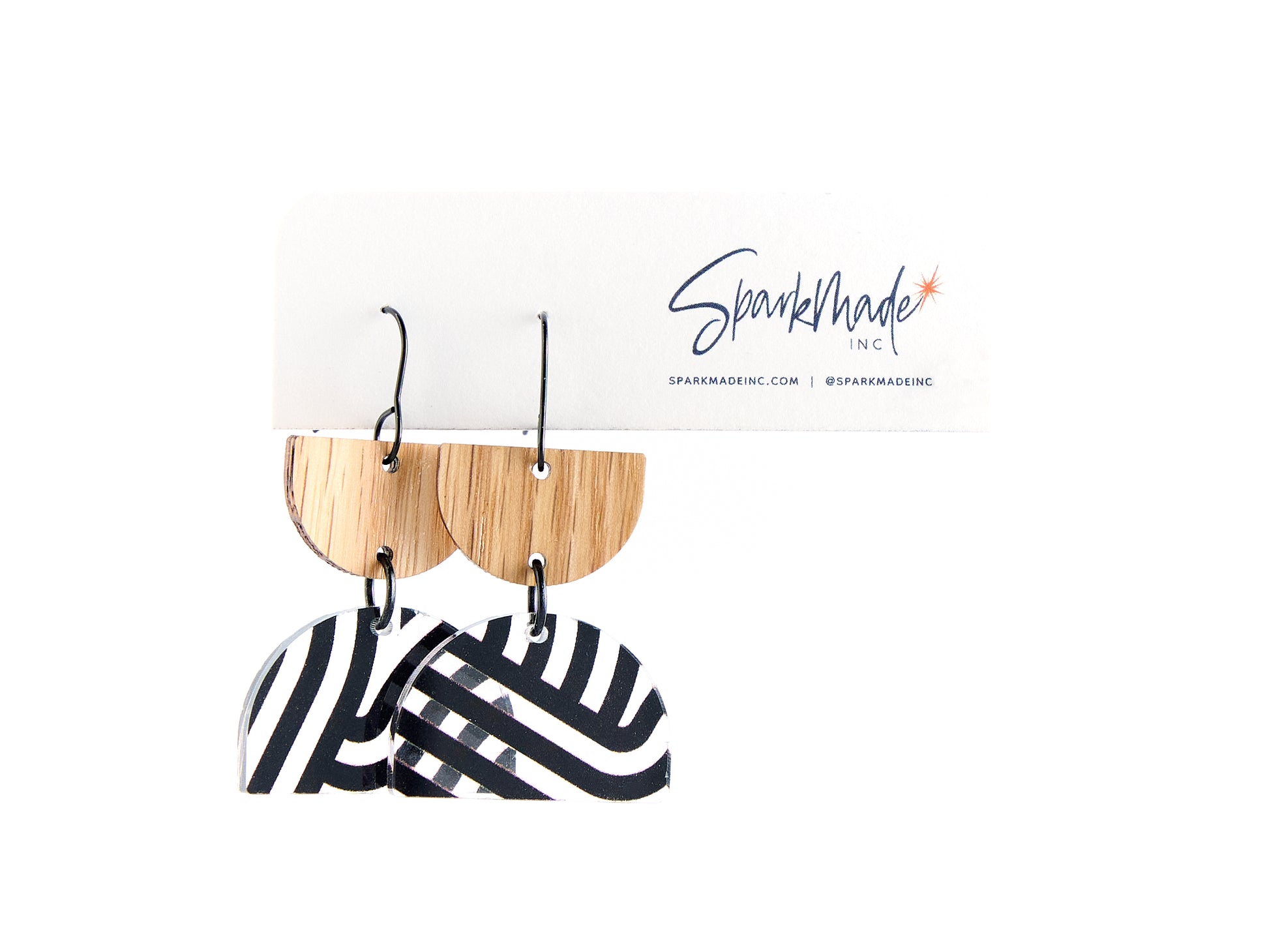 These Black Pattern Half Circle Earrings feature clear acrylic with a distinct black pattern, artfully paired with ash wood for a natural contrast. Lightweight and durable, they hang securely from stainless steel hook ear wires, combining style with comfort and hypoallergenic quality. Ideal for adding a modern, sophisticated touch to any outfit.