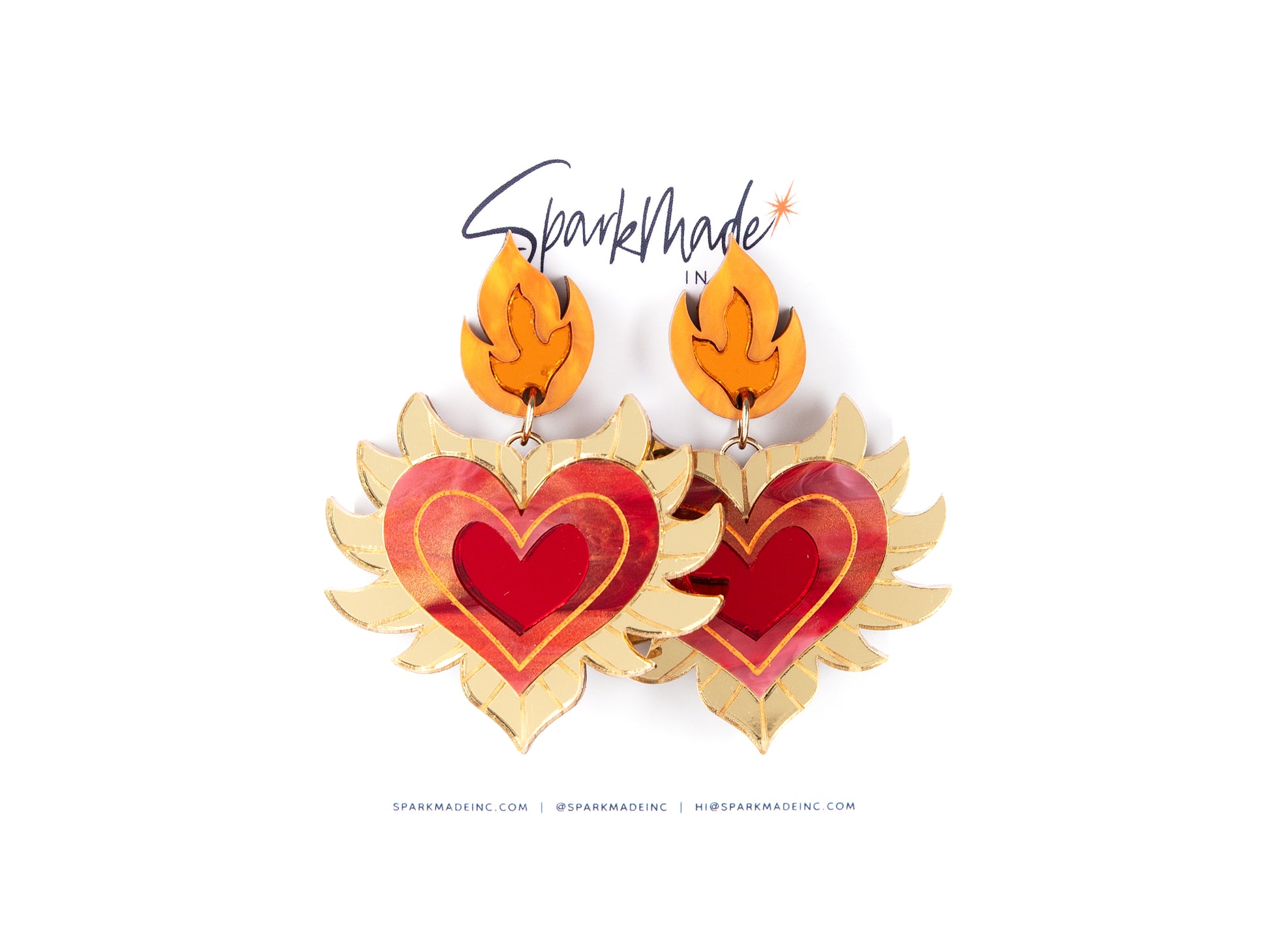 The Flaming Heart earrings are designed to feel bold, romantic, and a little rebellious. Inspired by the classic sacred heart motif, this design blends symbolism and modern materials into a piece that feels both meaningful and fashion-forward.