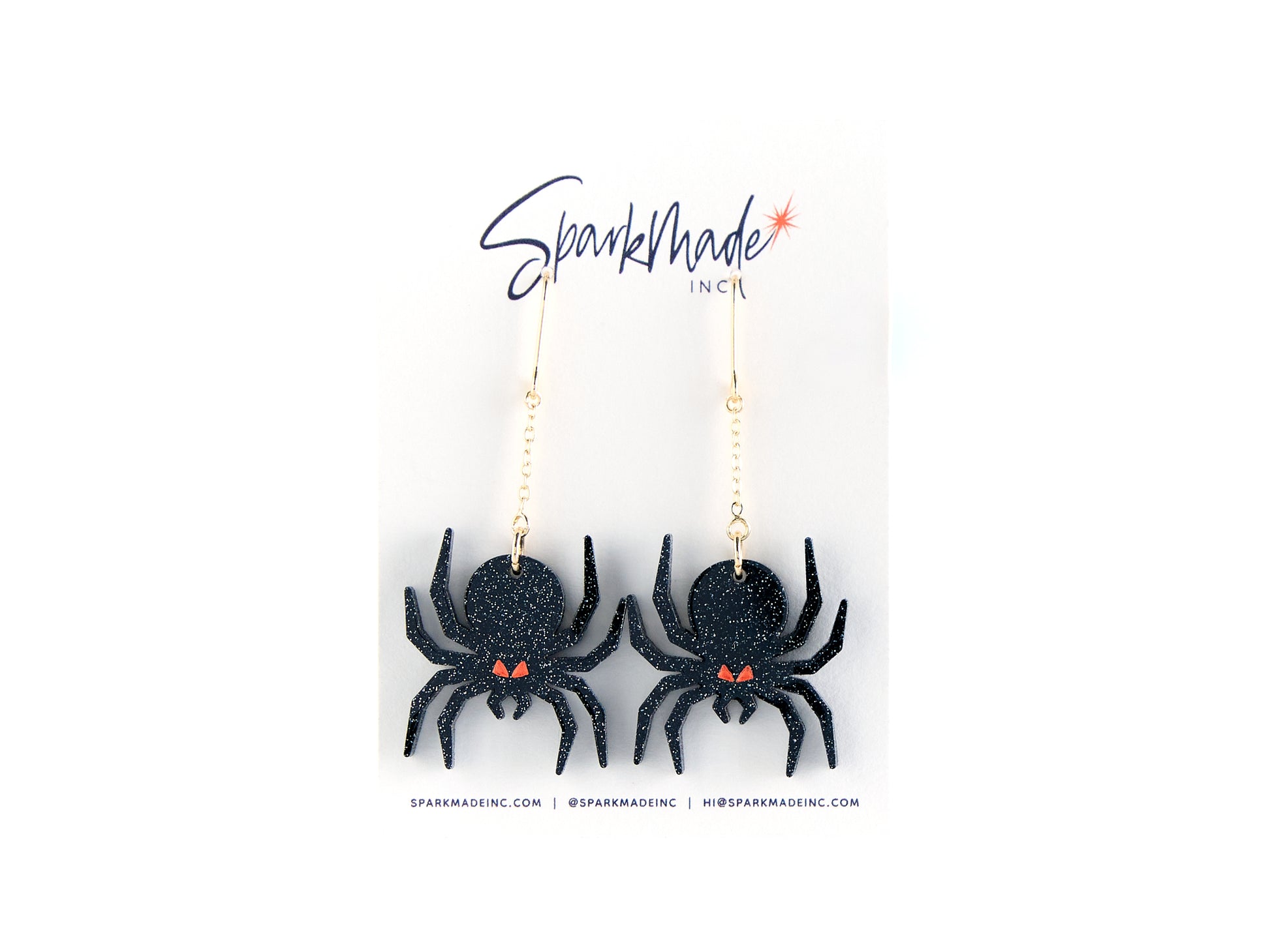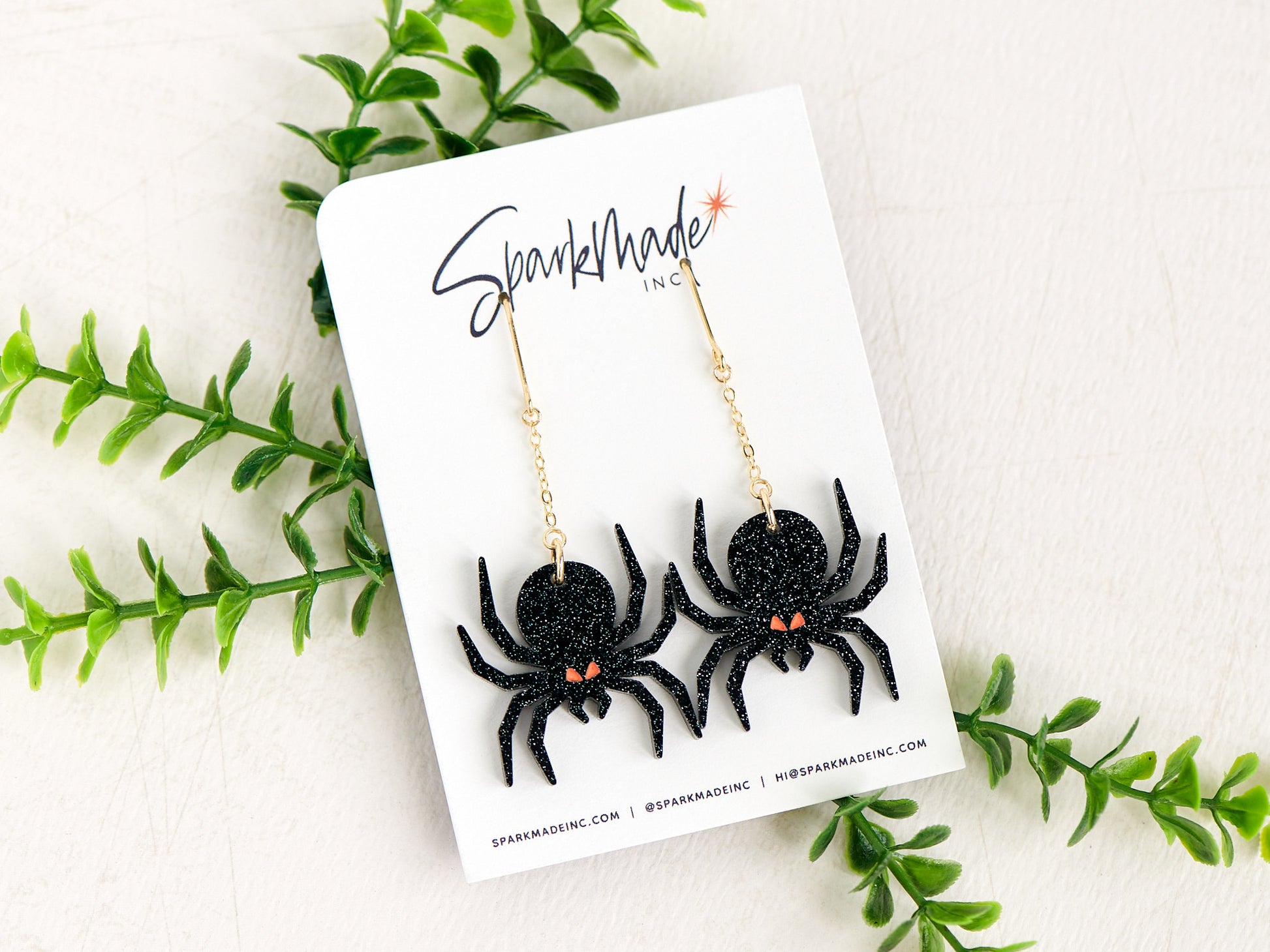 The Halloween Hanging Spider Drop Earrings are one of the latest additions to our spooky accessory collection! Crafted with meticulous precision and a touch of enchantment, these glitter black acrylic earrings embody the essence of Halloween.