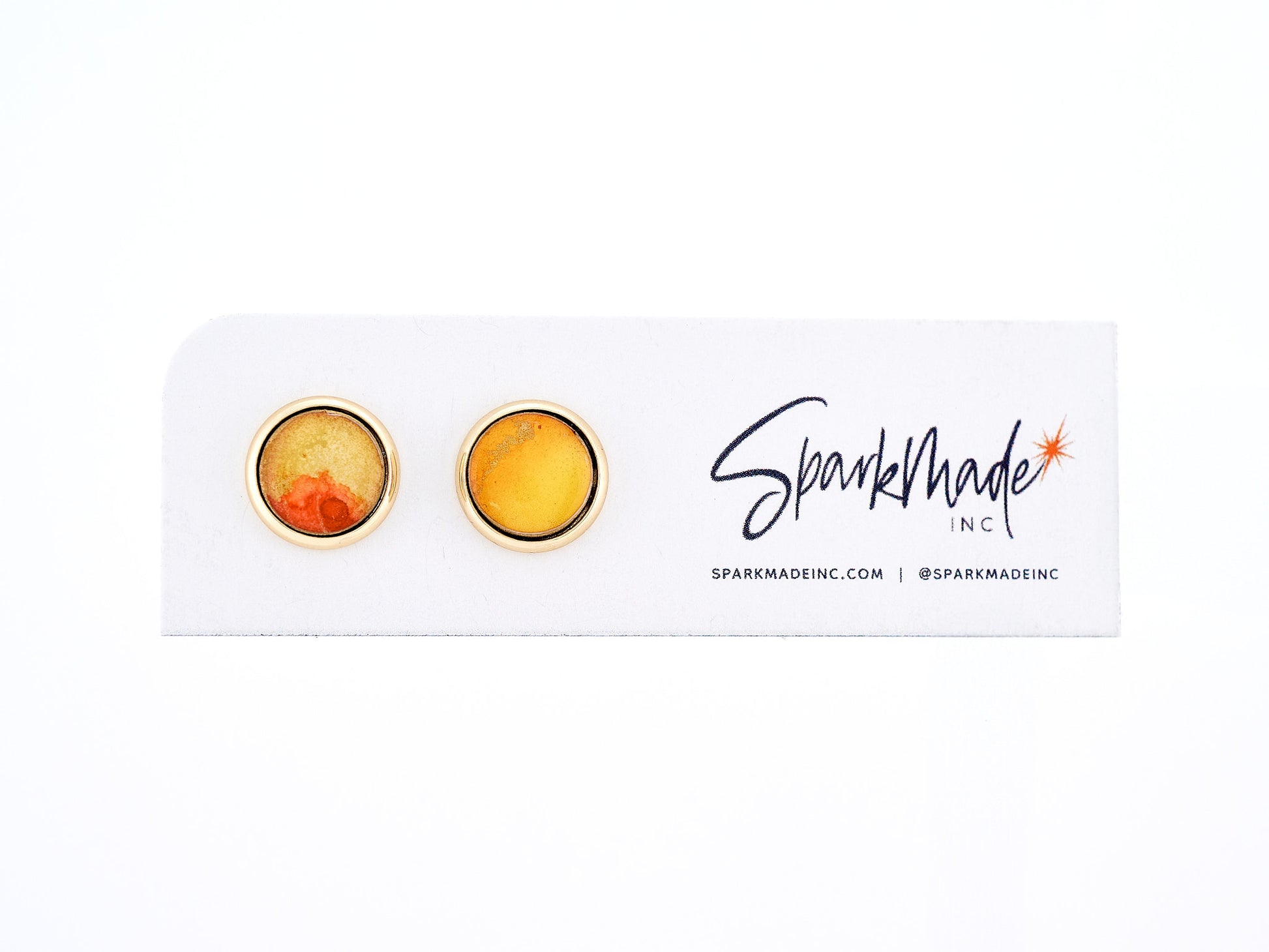 Our Inked 14k Gold Plated Stud Earrings are a unique and sophisticated addition to any jewelry collection. Crafted using alcohol inks art and coated with resin for a stunning and glossy finish, each pair of earrings is a one-of-a-kind work of art. The 14k gold-plated silver cabochon bezel posts provide a touch of luxury, while the light-catching design is sure to draw attention and admiration.