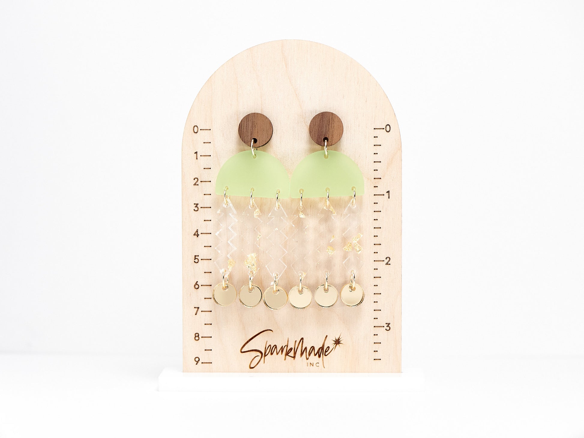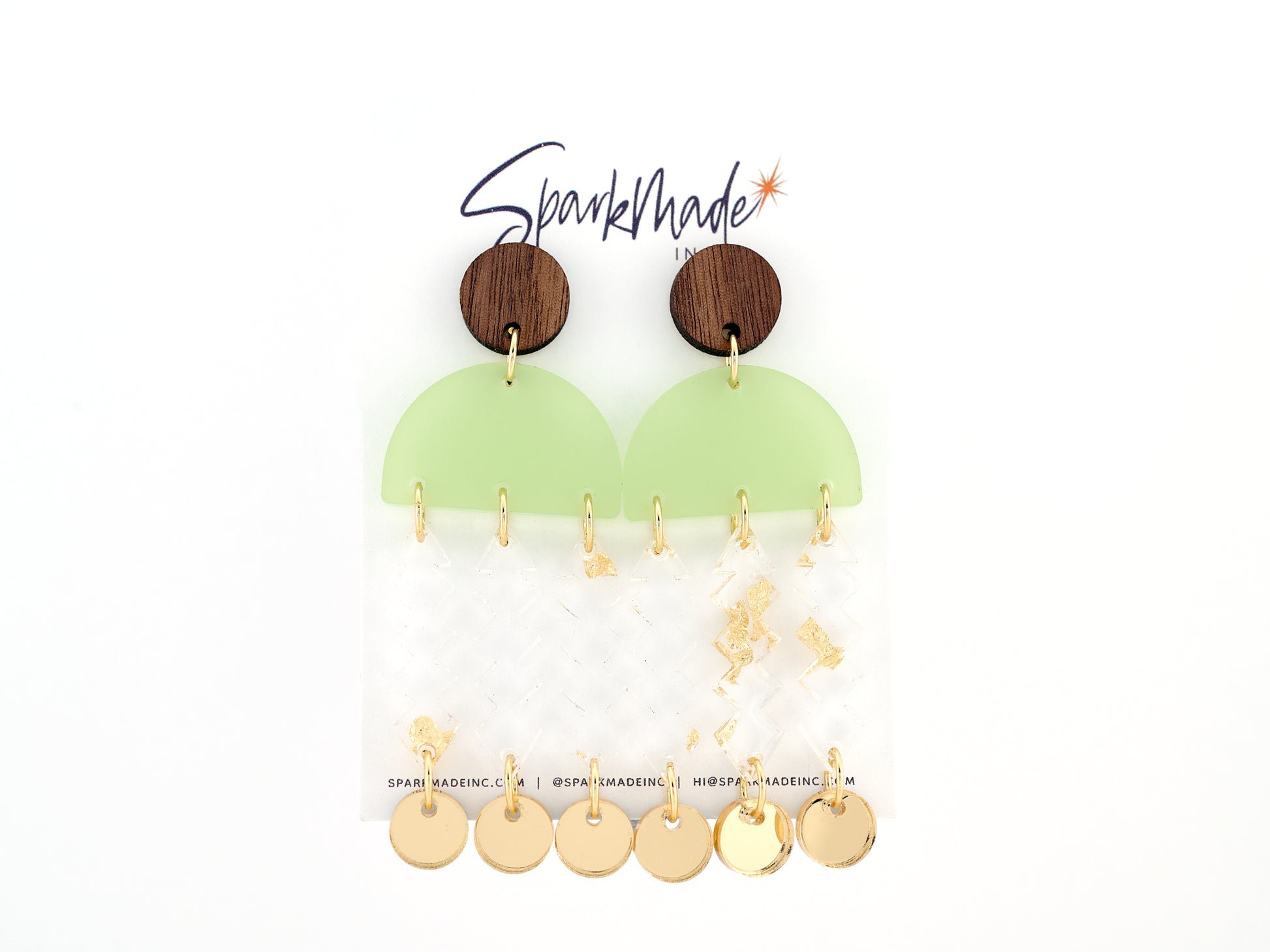 The Jelly Frosted Drop Earrings are made with a combination of frosted acrylic, clear acrylic with gold flakes, walnut hardwood, gold mirror acrylic, and stainless steel posts. The frosted acrylic and gold flakes give the earrings a beautiful and ethereal quality, reminiscent of the translucence of jellyfish. The gold mirror acrylic adds a touch of glamor, while the walnut hardwood gives the earrings a natural and warm touch.