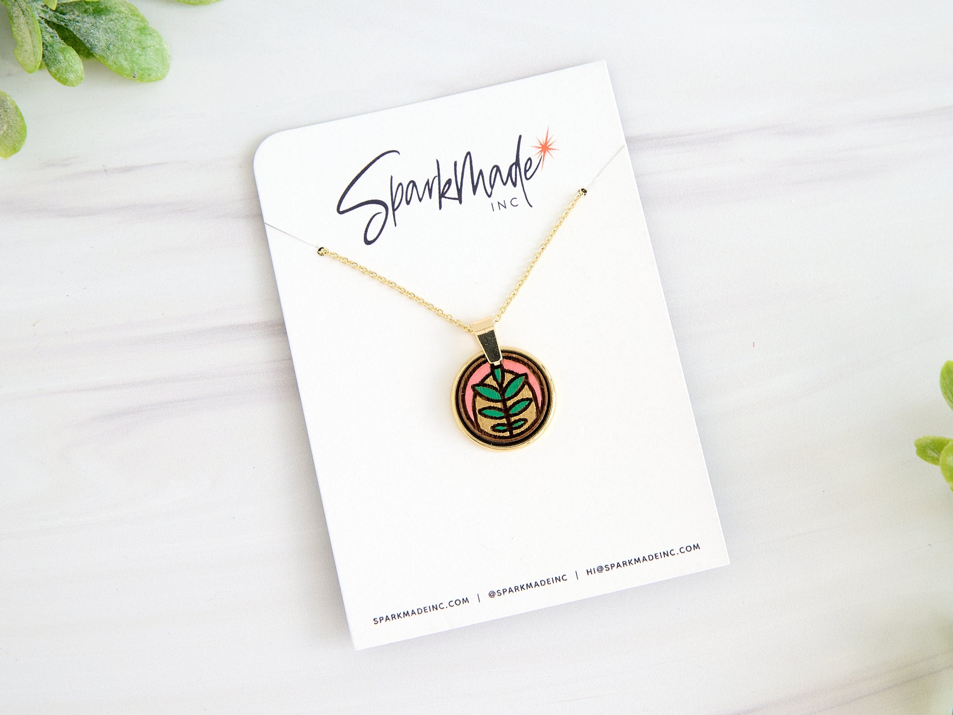 The Life Growing Hand Painted Pendant is a piece that encapsulates the beauty of nature. Handcrafted with precision, this pendant features a stunning walnut hardwood base, accentuated with a lustrous 14k gold plated bail for a touch of elegance. The intricate hand-painted design depicts the vibrant cycle of life, showcasing our delicate nature. Encased within a 14k gold plated decorative frame ring, this pendant truly stands out as a work of art. Embrace the timeless beauty of nature with our Life Growing Hand Painted Pendant.