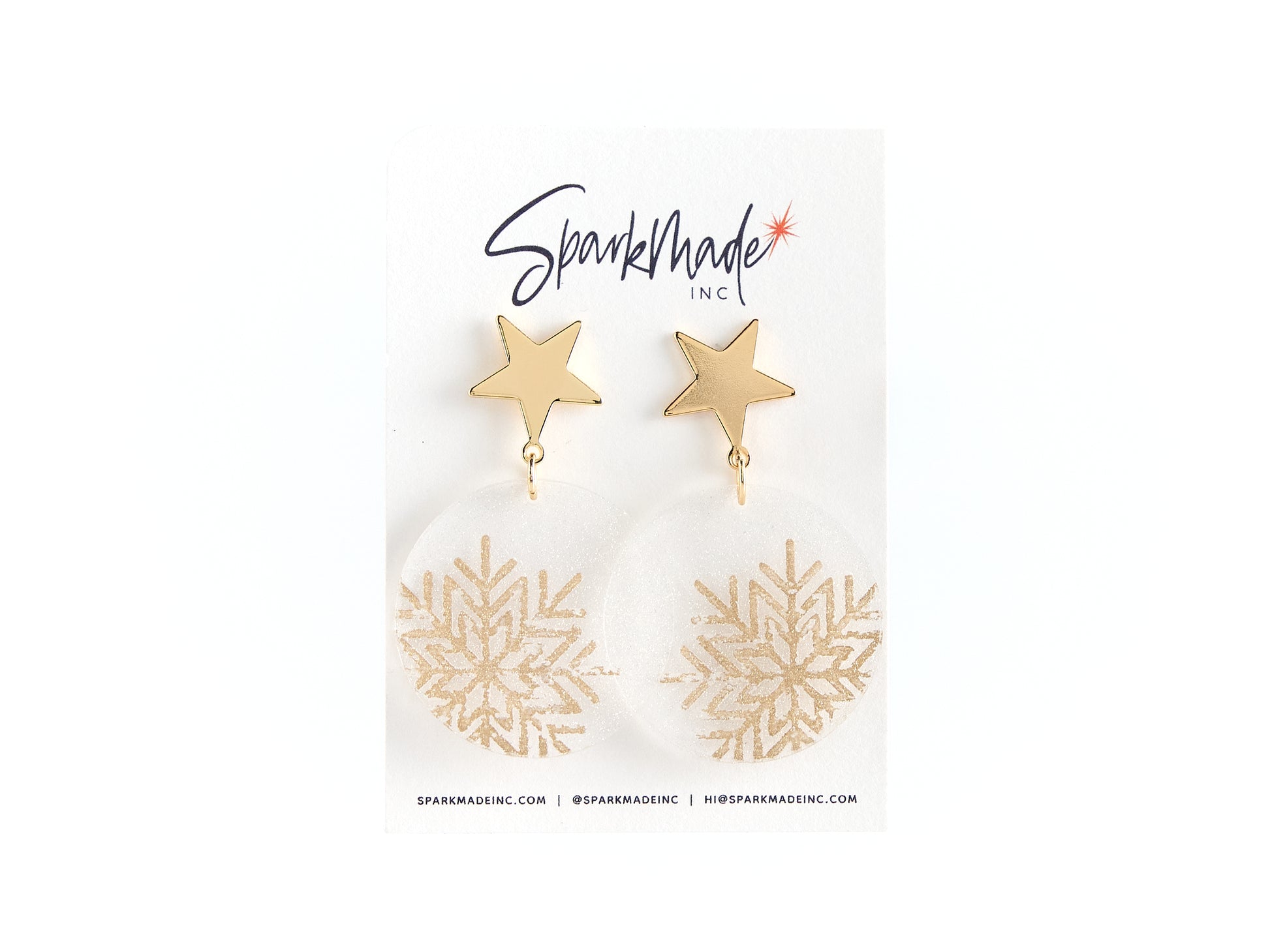 Add a touch of elegance and sparkle to your holiday ensemble with our Snowflake Christmas Earrings. Crafted from the finest clear sparkle acrylic, these earrings are designed to catch the light and mesmerize all who behold them. Each delicate snowflake is meticulously hand painted with intricate detailing, showcasing the artistry and care that goes into creating these stunning pieces. The snowflake engraving, along with the 14k real gold plated star studs, adds an extra level of charm and sophistication making these earrings the perfect accessory for any festive occasion. Whether you're attending a holiday party or simply want to spread some cheer, our Snowflake Christmas Earrings are sure to make a statement that will be remembered for years to come.