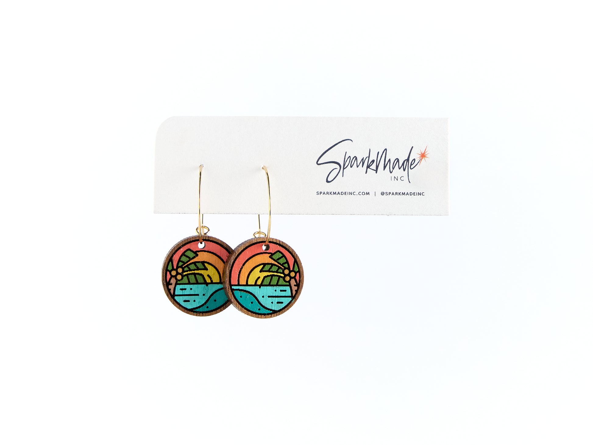 Sunrise Beach Hand Painted Walnut Hoop Earrings