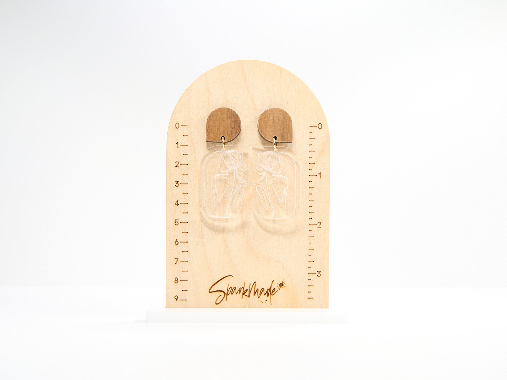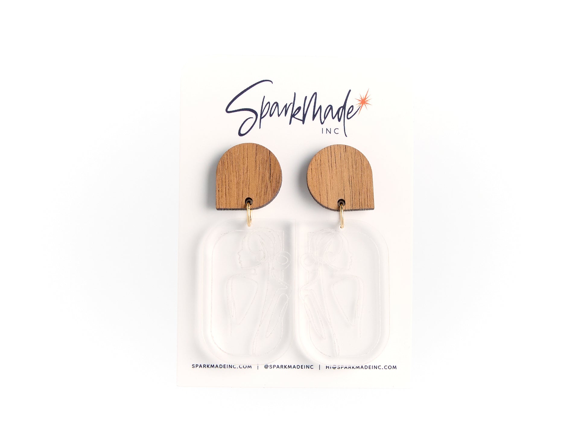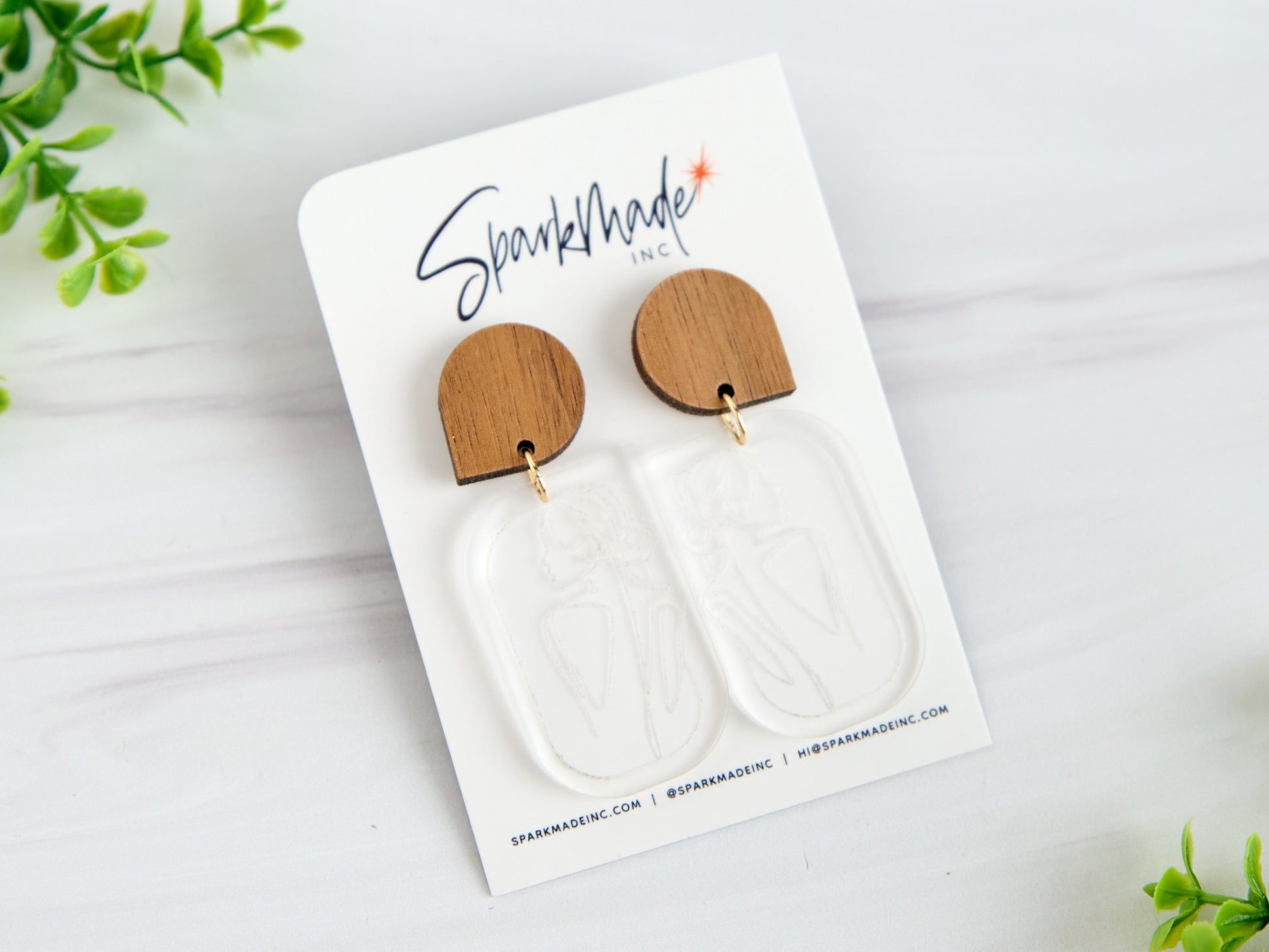 Crafted from clear acrylic, these earrings feature a finely engraved silhouette of a woman, paired with rich walnut hardwood accents. The combination of durable materials and precise engraving creates a sophisticated accessory that balances modern design with natural warmth, perfect for those who appreciate detailed craftsmanship and subtle elegance.